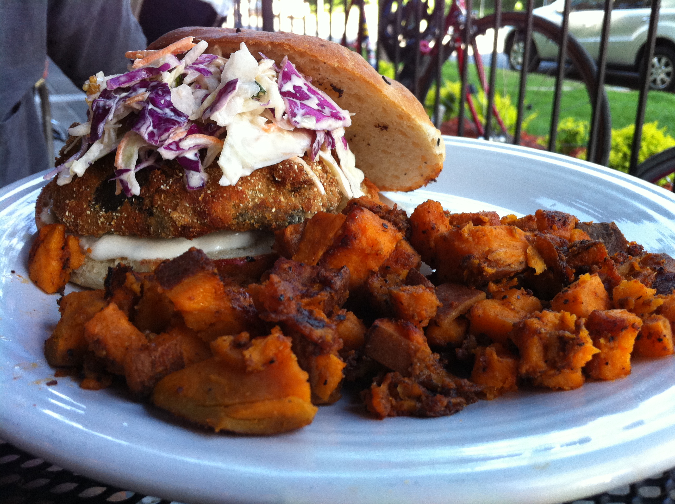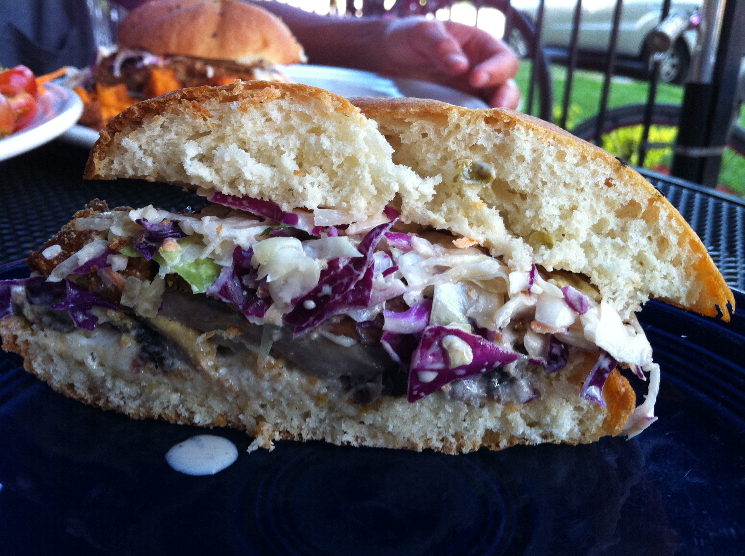 A crispy polenta encrusted portobello mushroom cap on a home-made bun topped with chipotle and coleslaw. With a side of sweet potatoes and washed down with a local microbrew. BOOM!! Shroom Sandwichgasm numero UNO!