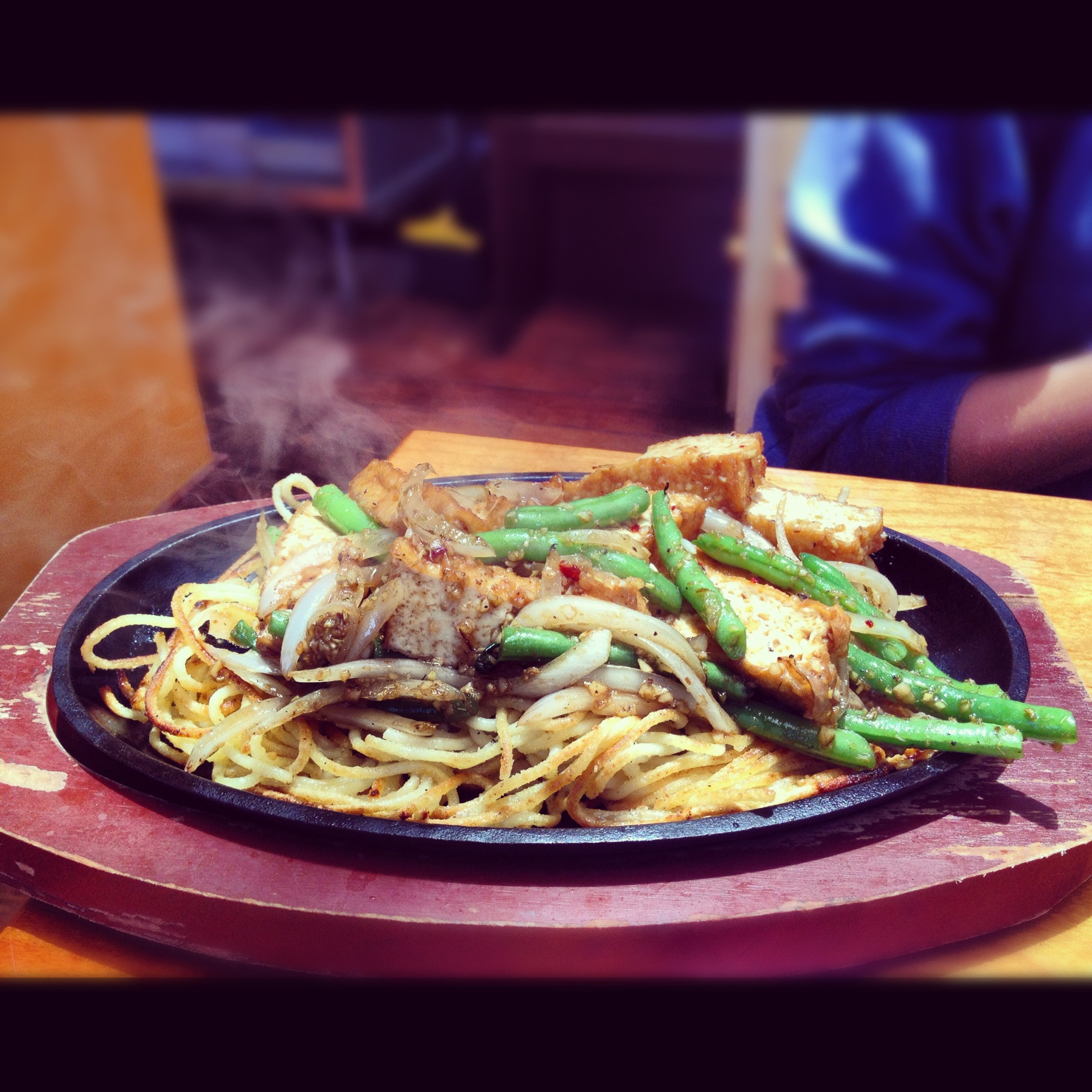 viet-nom-ese dish July 6, 2012July 8, 2012 KaylanSLeave a comment Lemongrass tofu stir fried with string beans, onions and garlic sauce over iron skillet crispy garlic noodles